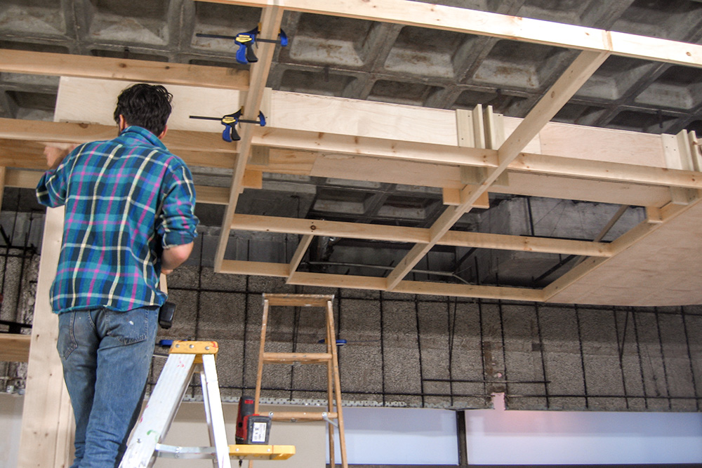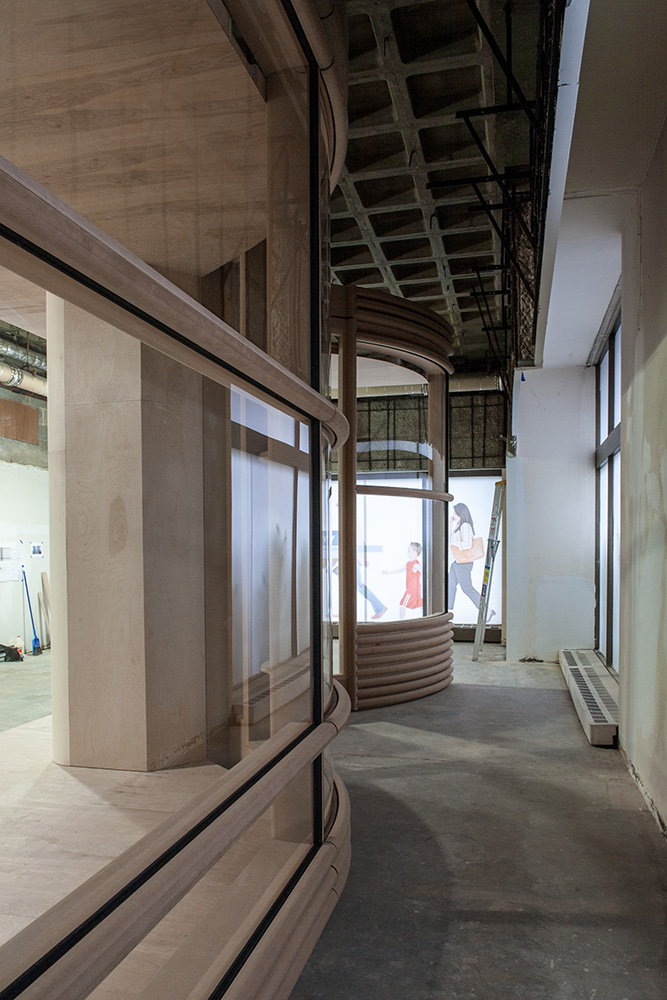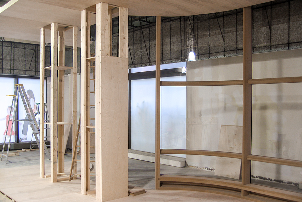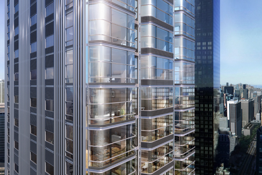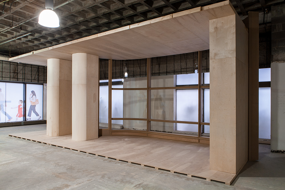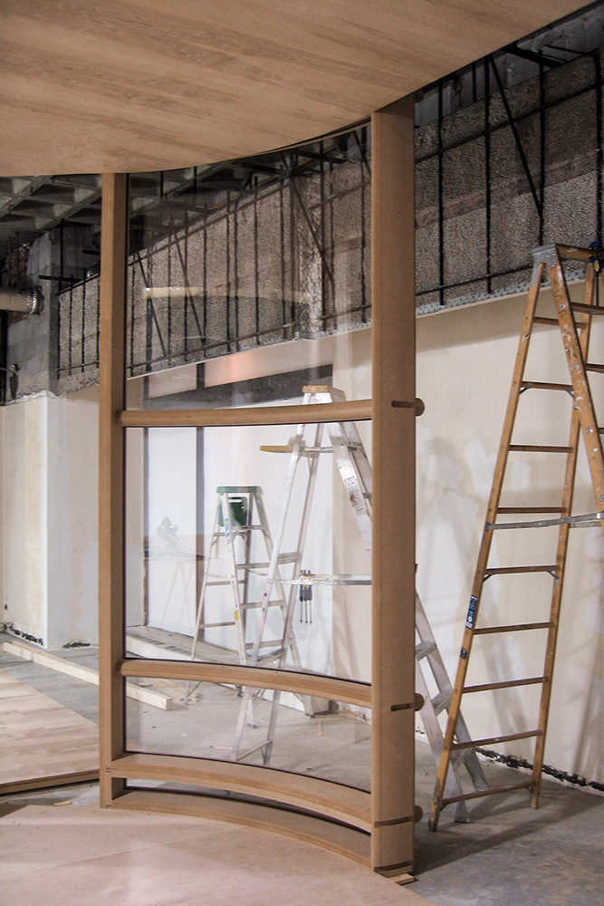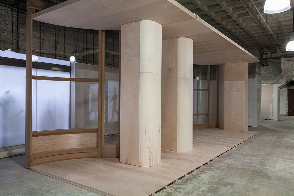 A 1:1 scale visual mockup for client presentation of a mixed use highrise at the United Nations Plaza in New York. The mockup shows a typical living room and partial bathroom facade. The mockup was built of MDF and lumber in shop and assembled onsite. The entire facade consisted of rounded profiles and curves, as well as curved plexiglass to simulate curved glass.