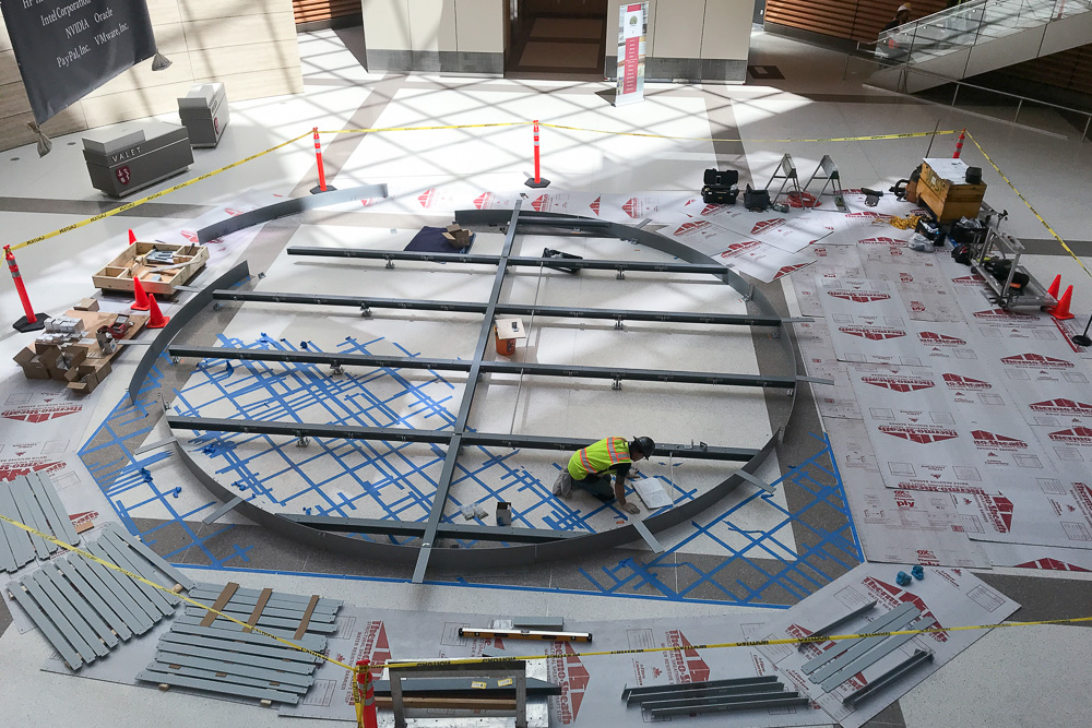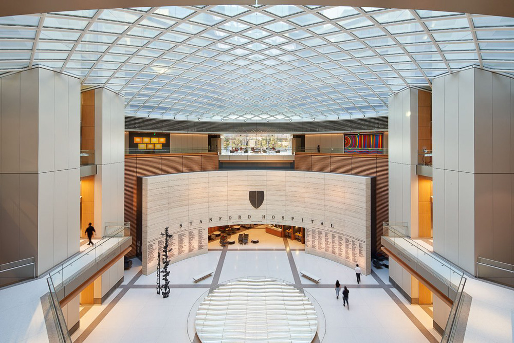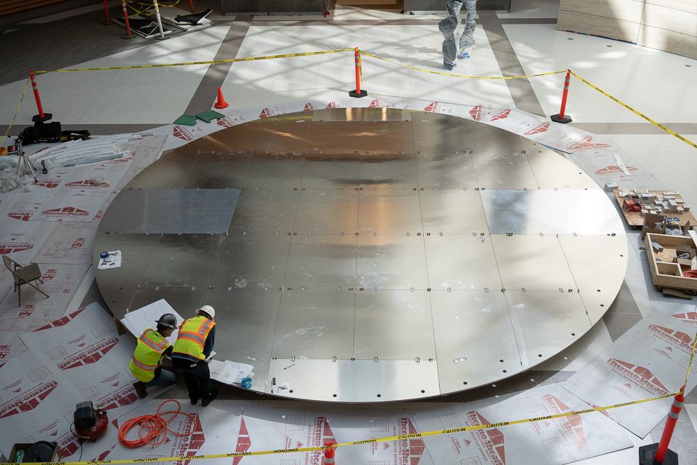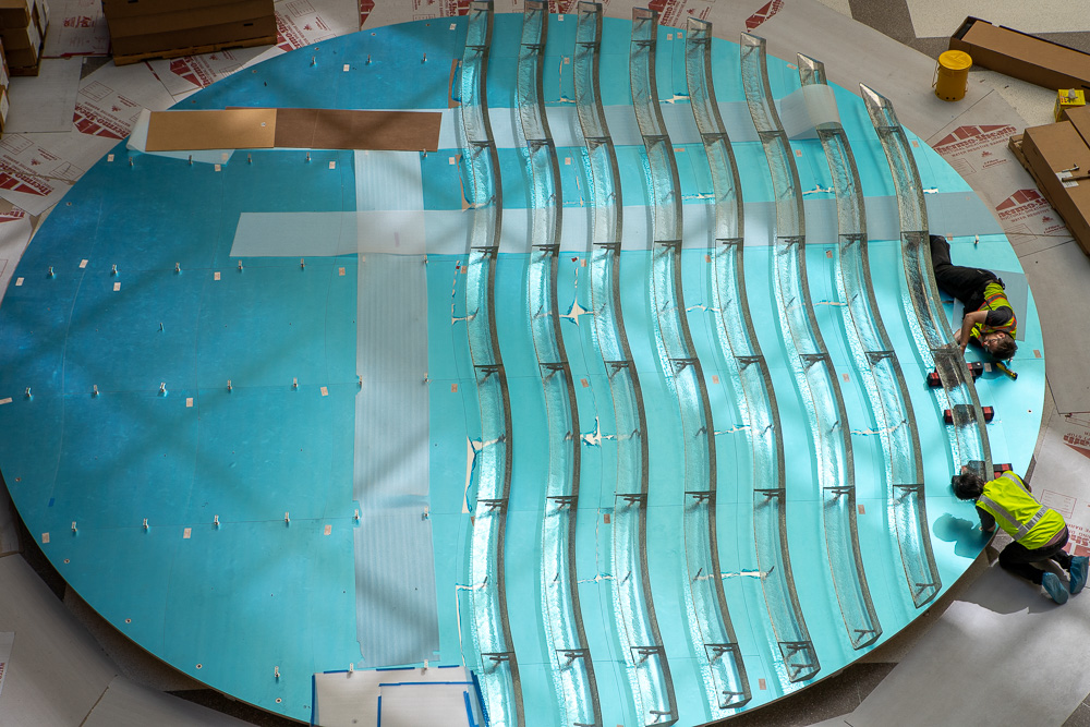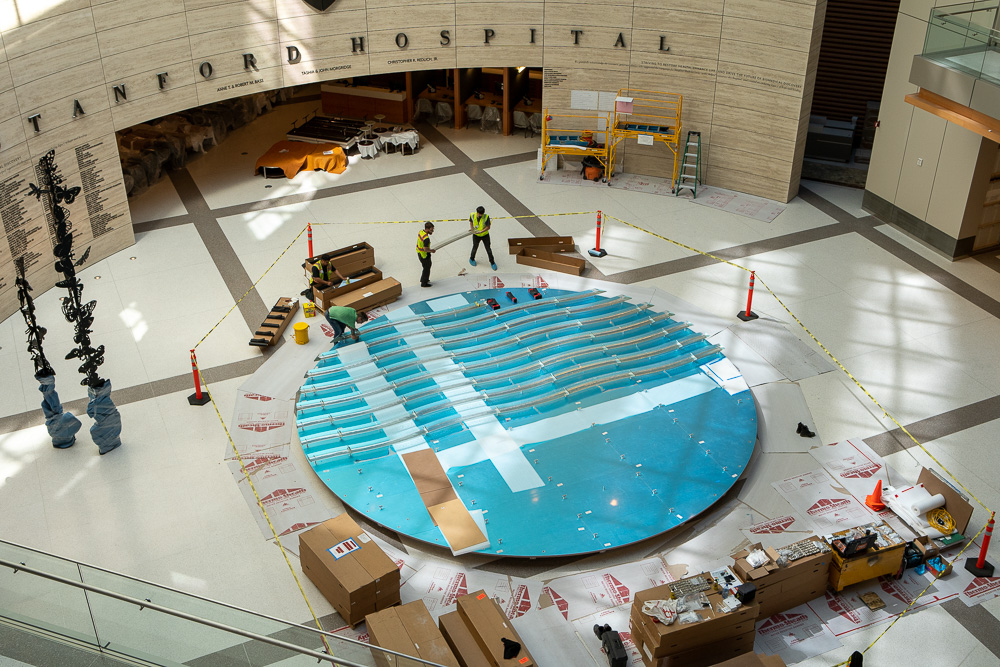 The artwork is installed in the atrium of the new Stanford University Hospital, by Rafael Viñoly Architects on Stanford University campus in Paolo Alto, CA. The artwork represents a “light” reflecting pool made up of 92 individual cast glass arcs hovering suspended above a highly spectral metal disk plane.