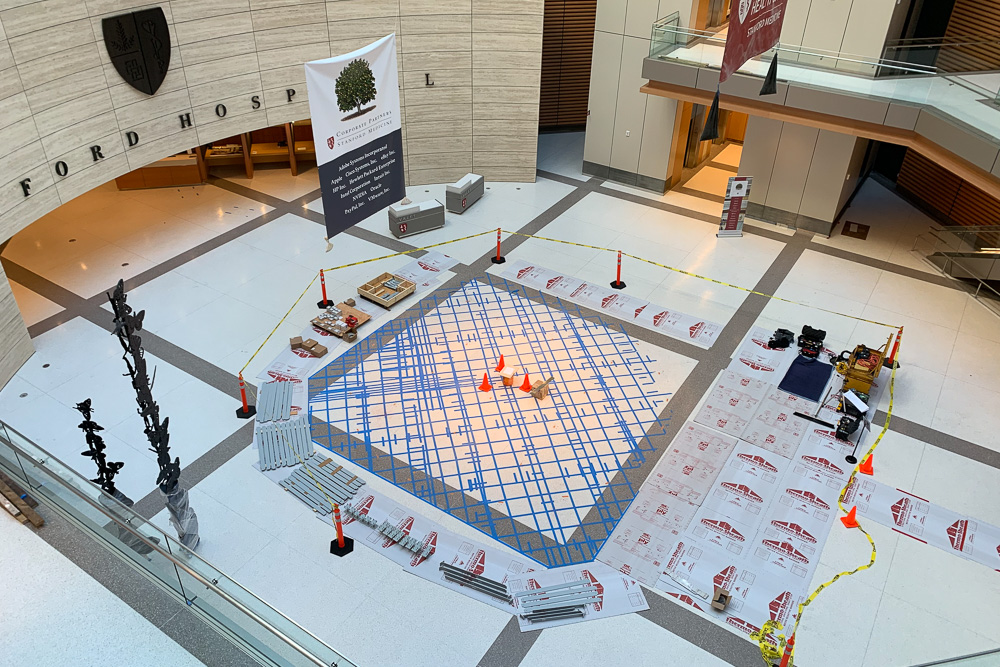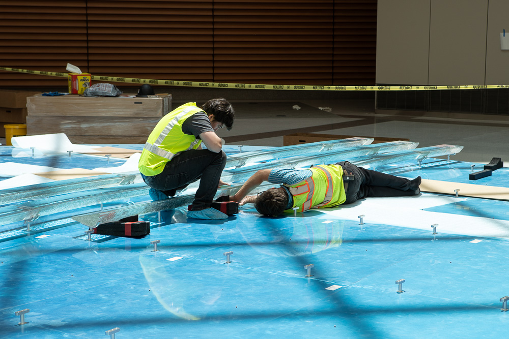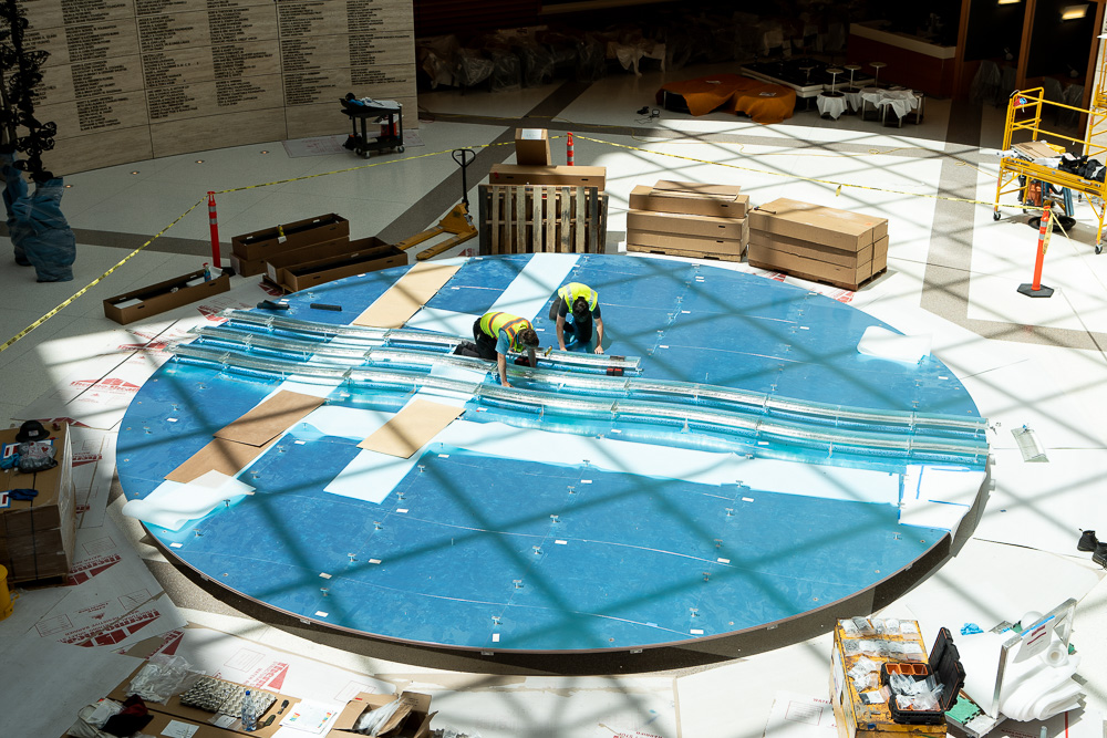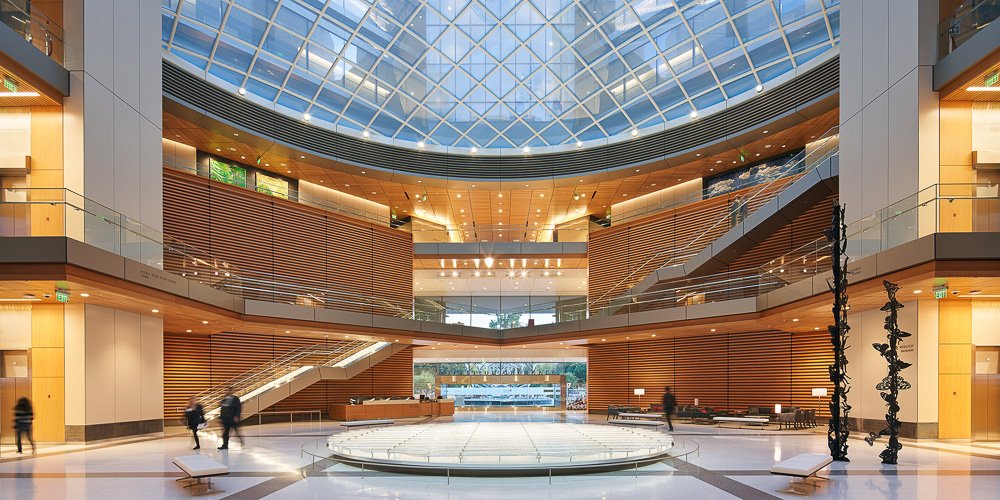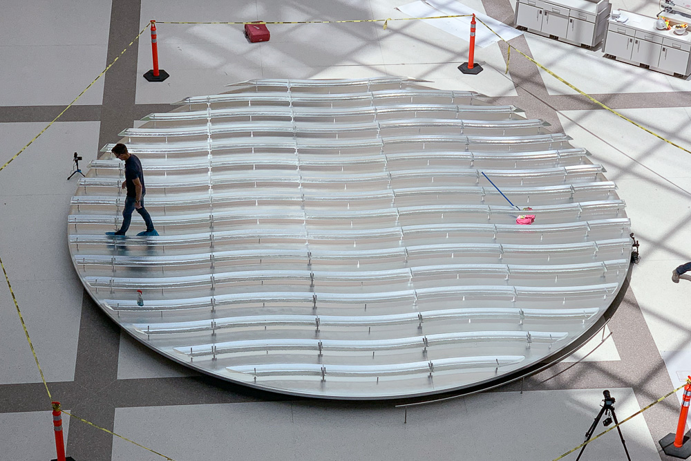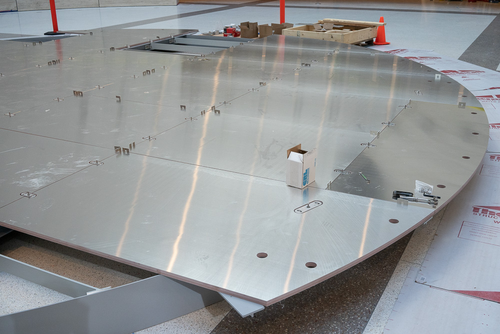 The artwork is installed in the atrium of the new Stanford University Hospital, by Rafael Viñoly Architects on Stanford University campus in Paolo Alto, CA. The artwork represents a “light” reflecting pool made up of 92 individual cast glass arcs hovering suspended above a highly spectral metal disk plane.